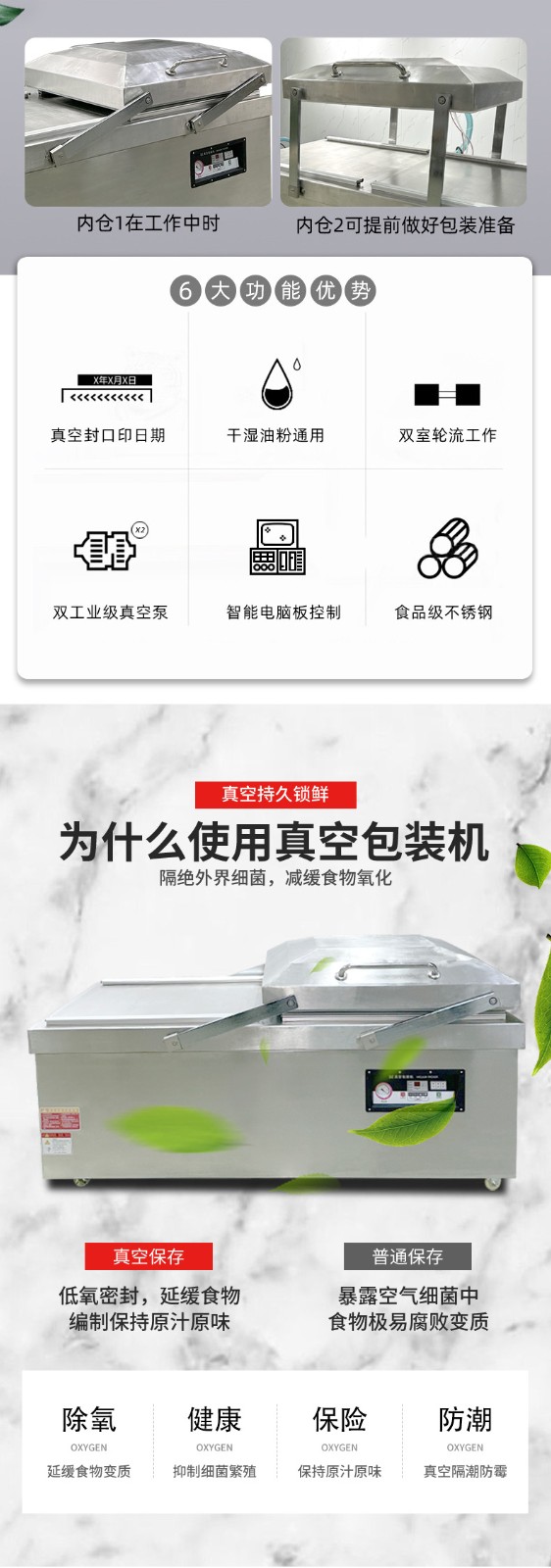 - 材質(zhì):優(yōu)質(zhì)品牌通常采用 304 不銹鋼制作機(jī)身和真空室,如諸城冠通機(jī)械的 600 型素肉雙室真空包裝機(jī),其真空室采用超厚 304 不銹鋼板,厚度達(dá) 4mm,長(zhǎng)期使用不變形、不漏氣13。而一些低價(jià)品牌可能使用普通不銹鋼甚至是鐵材質(zhì)外包不銹鋼皮,容易生銹腐蝕,影響機(jī)器壽命和包裝質(zhì)量。
