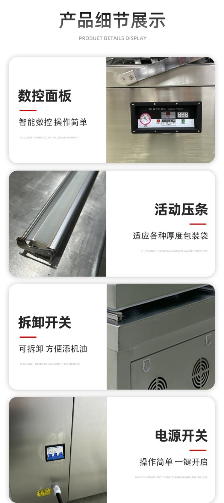 - 制造工藝:大品牌生產(chǎn)工藝成熟,焊接、打磨等工藝精細(xì),真空室密封性好。例如,采用高密度材料制作的 V 形密封條,能保證設(shè)備的密封性和耐壓、耐磨性14。小品牌可能因工藝粗糙,導(dǎo)致真空室有縫隙,影響真空度和封口質(zhì)量。