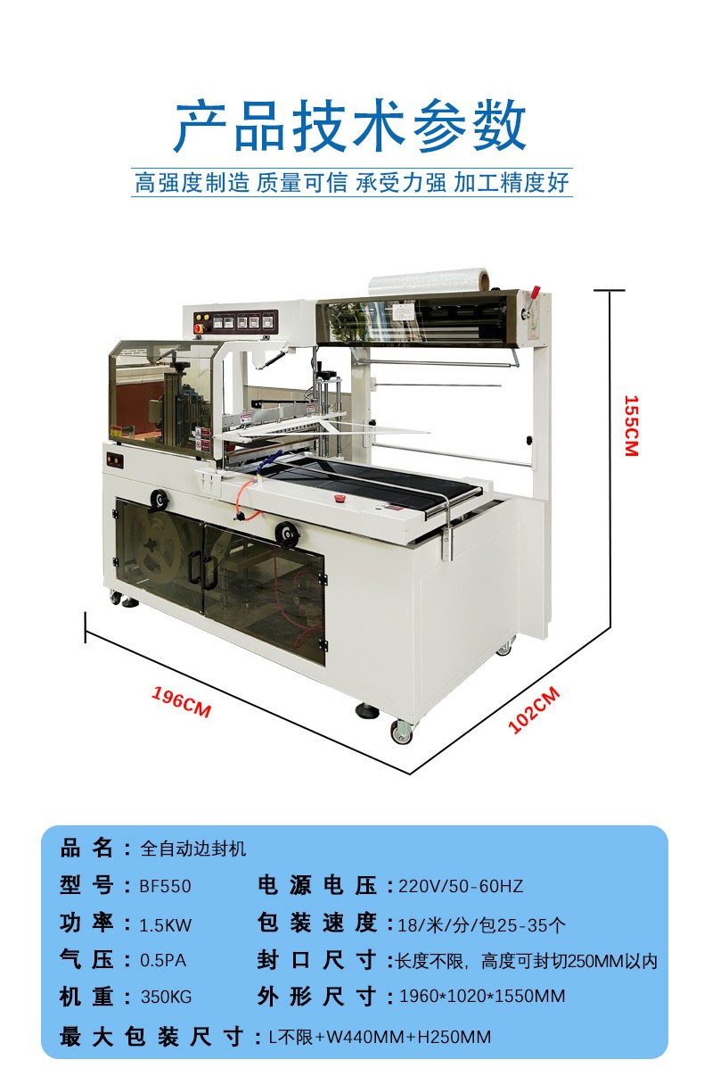 • 尺寸:如果產(chǎn)品尺寸較大,需要選擇能夠容納大尺寸產(chǎn)品的全自動邊封收縮機(jī),包括薄膜輸送系統(tǒng)能夠提供足夠?qū)挼谋∧ぃ叿庋b置能夠?qū)^寬的側(cè)邊進(jìn)行封口,熱收縮通道也有足夠的空間讓產(chǎn)品通過并收縮。例如,對于大型家電產(chǎn)品的包裝,就需要較大型的設(shè)備,其最大包裝尺寸可能要達(dá)到長 2000mm、寬 1000mm、高 800mm 左右。