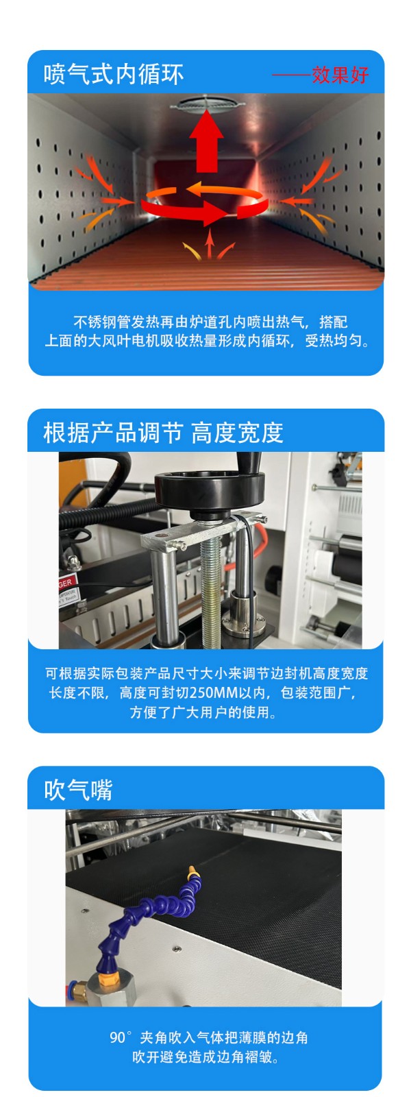 • 邊封完成后的產(chǎn)品被輸送到熱收縮通道。熱收縮通道內(nèi)的加熱元件(如電熱管或者紅外加熱裝置)開始工作,產(chǎn)生大量的熱空氣。通風(fēng)裝置會將熱空氣均勻地分布在通道內(nèi),使產(chǎn)品周圍的薄膜能夠均勻受熱。