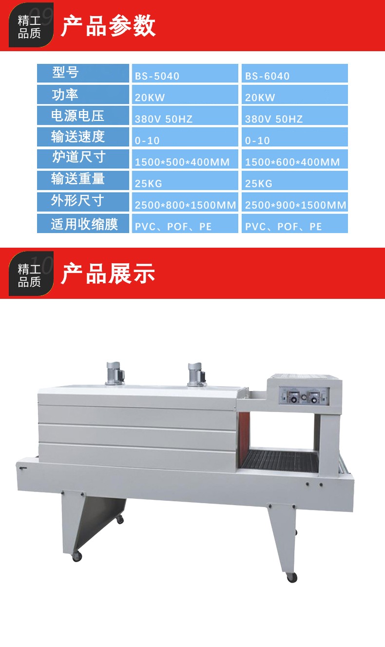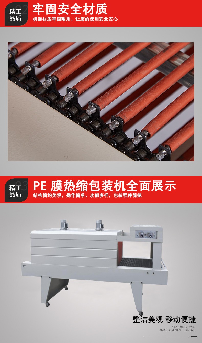 • 主要包括輸送帶和驅(qū)動電機(jī)。輸送帶用于承載并輸送被 PE 薄膜包裹的產(chǎn)品通過加熱區(qū)域。驅(qū)動電機(jī)控制輸送帶的速度,這個速度是可以調(diào)節(jié)的。其重要性在于確保產(chǎn)品在加熱區(qū)域停留足夠的時間,讓 PE 薄膜充分收縮。例如,如果輸送帶速度太快,PE 薄膜可能來不及完全收縮就離開了加熱區(qū)域,導(dǎo)致包裝質(zhì)量不佳;如果速度太慢,又會影響包裝效率。