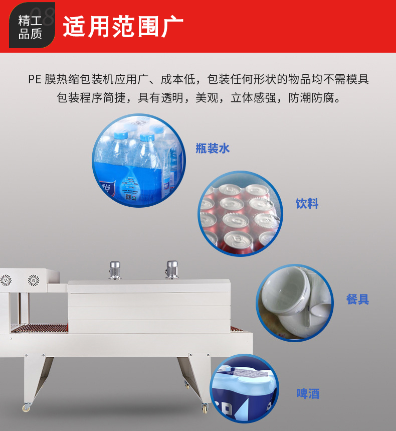 • PE 薄膜本身具有良好的柔韌性,再加上 PE 熱收縮機(jī)可以通過調(diào)節(jié)輸送速度、加熱溫度等參數(shù),使得它能夠?qū)Ω鞣N形狀(如圓形、方形、不規(guī)則形狀)和尺寸的產(chǎn)品進(jìn)行包裝。例如,無論是包裝小型的文具,還是大型的工業(yè)零部件,PE 熱收縮機(jī)都能發(fā)揮作用。